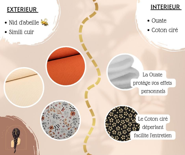Extérieur : Coton nid d'abeille et simili cuir fleuri.